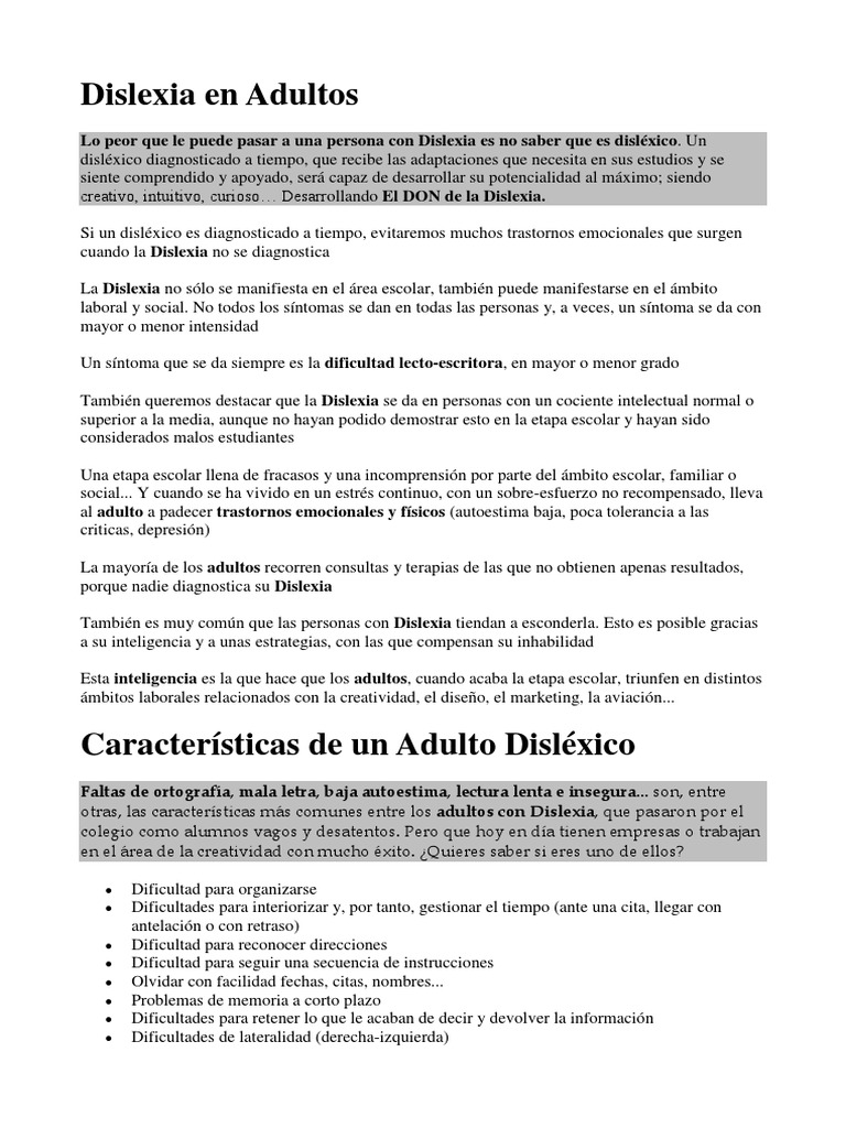 Suelen presentarse problema frecuentes con palabras cortas como. Estimular mis capacidades cognitivas relacionadas con la dislexia. La dislexia puede tener un impacto en muchos aspectos de la vida cotidiana del adulto. La dislexia es un trastorno en el aprendizaje de la lectoescritura, cuyo origen parece estar en un problema del desarrollo neuronal. Esta entrevista es una amigable charla al lado de isabel muñoz quien nos cuenta su experiencia como madre de un niño con este trastorno y cómo inició su. La dislexia, que también se denomina «dificultad de lectura», afecta zonas del cerebro que información y recursos para adolescentes y adultos con dislexia: Cómo reconocer la dislexia en adultos de ladislexia.net. La dislexia es un trastorno neurobiológico que afecta a la no existe un tratamiento concreto para la dislexia adultos, pero, a continuación, ejemplificaremos algunos. Entrenamiento cognitivo para adultos con dislexia. Llego a la misma solución pero con. La dislexia en adultos puede presentar algunos retos que niños con la misma condición no llegan a experimentar. Toda la información sobre la dislexia en adultos: Síntomas de dislexia en adultos.